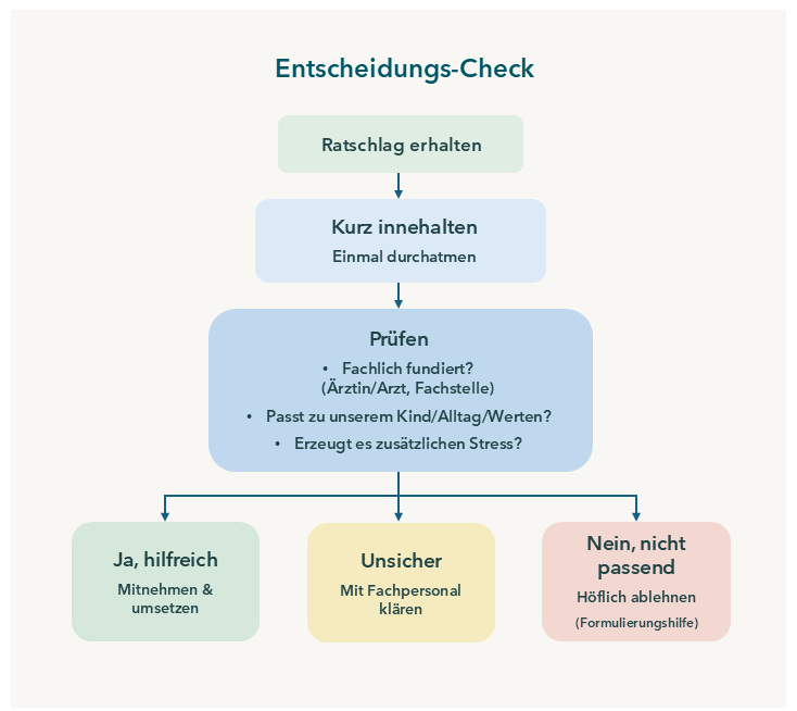 - Ist der Rat fachlich fundiert (z. B. Empfehlung der Kinderärztin/des Kinderarztes oder einer spezialisierten Fachstelle)?
